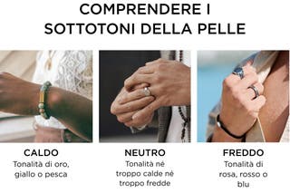 Hai bisogno di qualche suggerimento in più? Anche i gioielli possono aiutare a capire qual è il tuo sottotono. Se l'oro ti dona, è probabile che tu abbia sottotoni caldi. Se invece è l'argento a risaltare il tuo stile, un sottotono freddo è quello più probabile. Chi ha un sottotono della pelle neutro sta bene con entrambi.