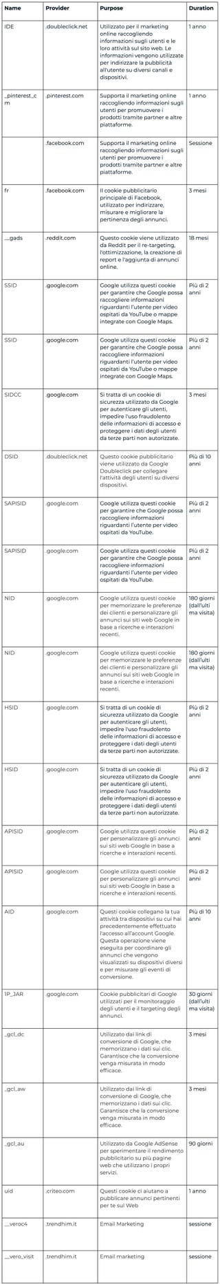 Utilizziamo cookie di tracciamento, statistici e tecnici. Per darti il maggior numero di informazioni possibili, abbiamo elencato la maggior parte dei cookie qui sotto: